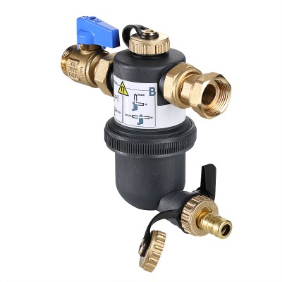 Наличие встроенного постоянного ниодимового магнита позволяет задерживать железосодержащие примеси потока, размеры которых меньше размера ячейки сетчатого фильтроэлемента. Детали корпуса шламоуловителя выполнены из технополимера IXEF, не подверженного коррозии. Стержневой магнит помещён в пластиковую гильзу, поэтому при вытаскивании магнита из гильзы, все налипшие частицы оседают в фильтровальной камере и могут быть легко удалены путём открытия дренажного шарового крана.