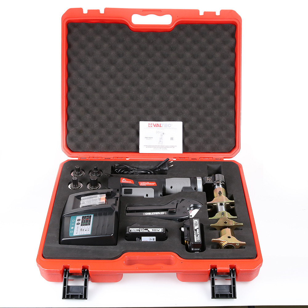 Комплект аккумуляторного инструмента для монтажа аксиальных фитингов включает в себя собственно пресс-инструмент, пресс-зажимы (16/20 и 25/32 мм), расширительные насадки (16, 20, 25, 32 мм), две литий-ионных аккумуляторных батареи (АКБ) общей емкостью 2 А•ч, зарядное устройство для АКБ (напряжение питания – 220 В, 50 Гц), шнур для зарядного устройства, резак для труб 16–32 мм. Оборудование помещено в кейс красного цвета.