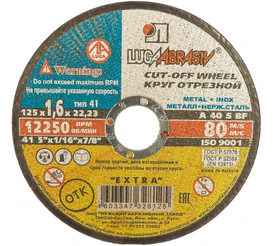 Круг отрезной по металлу, 125 х 1,6 х 22,2 мм (Луга)// Россия