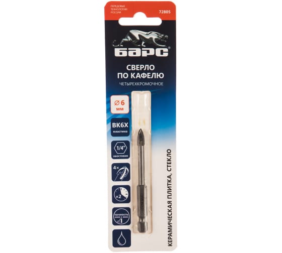 Сверло по керамической плитке 6 мм, крестовая пластинка, шестигранный хвостовик Барс