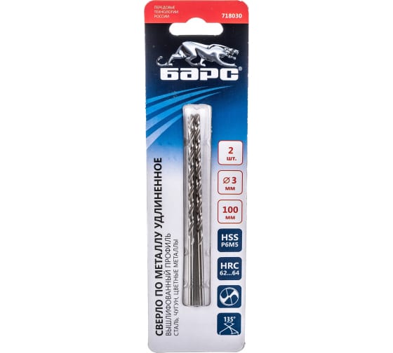 Сверло спиральное по металлу 3 х 100 мм, Р6М5, удлиненное, 2шт.// Барс