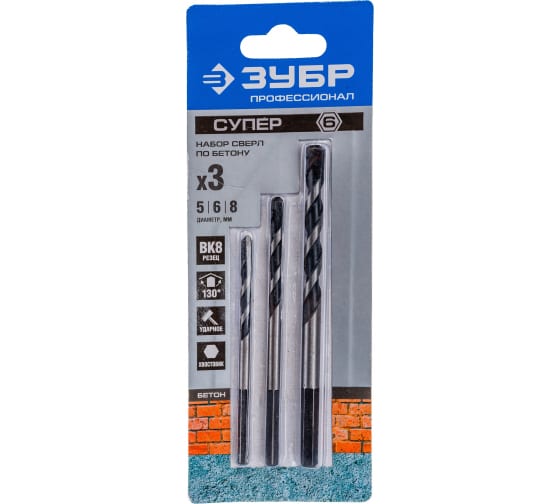 ЗУБР СУПЕР-6 3 шт: d 5-6-8 мм набор сверл по бетону с шестигранным хвостовиком ПРОФЕССИОНАЛ