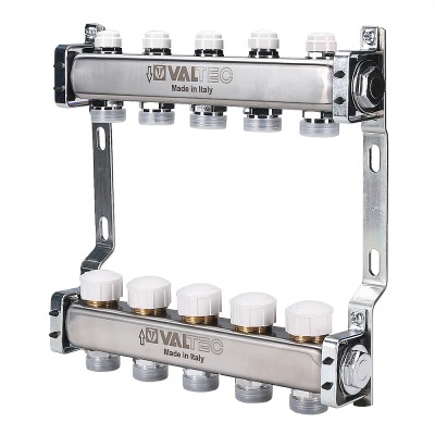 Коллекторный блок объединяет в себе подающий и обратный коллекторы из нержавеющей стали AISI 304, ручные балансировочные клапаны, регулирующие клапаны (с возможностью установки электротермического сервопривода), пробки коллекторов и крепежные кронштейны из оцинкованной стали. В состав блока не входят элементы сервисной группы.