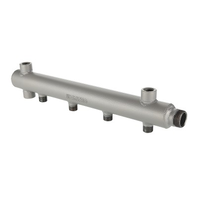 Коллектор характеризуется большим, чем у латунных аналогов, проходным сечением, что способствует нормальному выравниванию давления для подключенных потребителей. Межосевое расстояние отводящих патрубков – 100 мм. Резьба патрубков – наружная, 1/2". Число отводящих патрубков – от 2 до 9. Резьба коллектора – внутренняя, 1". В верхней части коллектора имеется отверстие ½” с внутренней резьбой под воздухоотводчик или манометр.