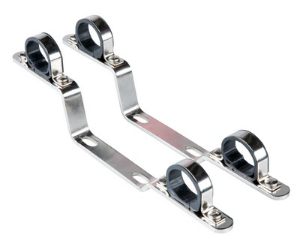 (VTc.130.IN) Кронштейны предназначены для крепления подающего и обратного коллекторов из нержавеющей стали VTc.588.EMNX, VTc.589.EMNX к несущей поверхности за шейки резьбовых патрубков. Состоят из крепежной планки, к которой винтами крепятся два стальных никелированных хомута. В хомуты вставлены пластиковые манжеты, служащие тепло- и виброзащитой и предохраняющие коллекторы от механических повреждений. Кронштейны обеспечивают разнос коллекторов по высоте на 200 мм (между осями) и на 32 мм по глубине.