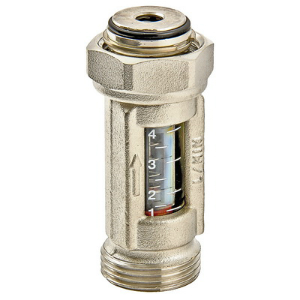 Шкала расходомера отградуирована в диапазоне 1–4 л/мин. Материалы изделия: латунь CW617N (корпус), полипропилен (поплавок), прозрачный поликарбонат (трубка со шкалой), нержавеющая сталь (пружина). Номинальное давление – 10 бар. Пропускная способность – 2,75 м3/ч Присоединение расходомера – «евроконус», накидная гайка/наружная резьба.