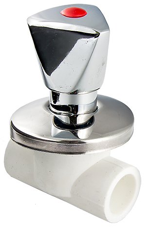 (VTp.713.0) Вентиль с корпусом из полипропилена (заделывается под штукатурку) и хромированными внешними деталями – удлиненной ручкой и декоративной чашкой. Предназначен для использования в составе полипропиленовых трубопроводов холодного и горячего водоснабжения. Монтаж осуществляется методом раструбной сварки.