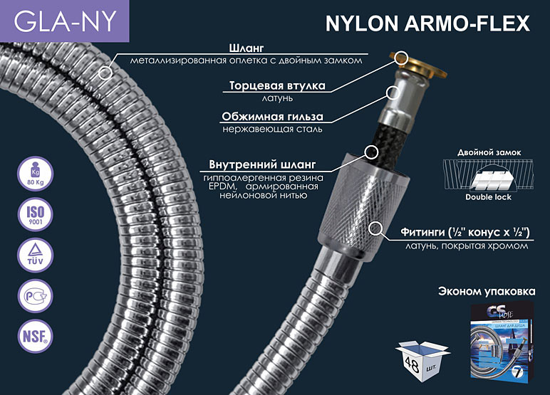 GLA-NY Шланг металл 1,5м. имп/кон. двойнок замок,нейлоновая вставка хром GS