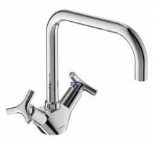 В избранном Убрать В избранное "Тринити" смеситель для кухонной мойки двуручковый, трубчатый поворотный излив, с пластиковой монтаж