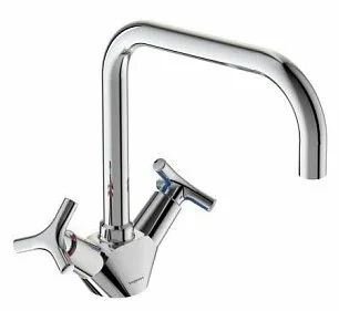 "Тринити" смеситель для кухонной мойки двуручковый, трубчатый поворотный излив, с пластиковой монтаж